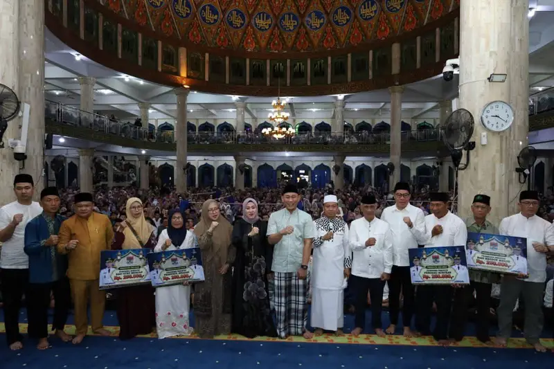 LUBUKLINGGAU – Wali Kota Lubuk Linggau, H Rachmat Hidayat (yoppy karim) bersama Wakil Wali Kota, H Rustam Effendi dan Sekda Lubuklinggau, H Trisko Defriyansa menghadiri kegiatan Tabligh Akbar dalam rangkaian penutupan perayaan Hari Ulang Tahun ke-24 Kota Lubuk Linggau, di Masjid Agung As-Salam, Selasa (21/10/2025) malam.